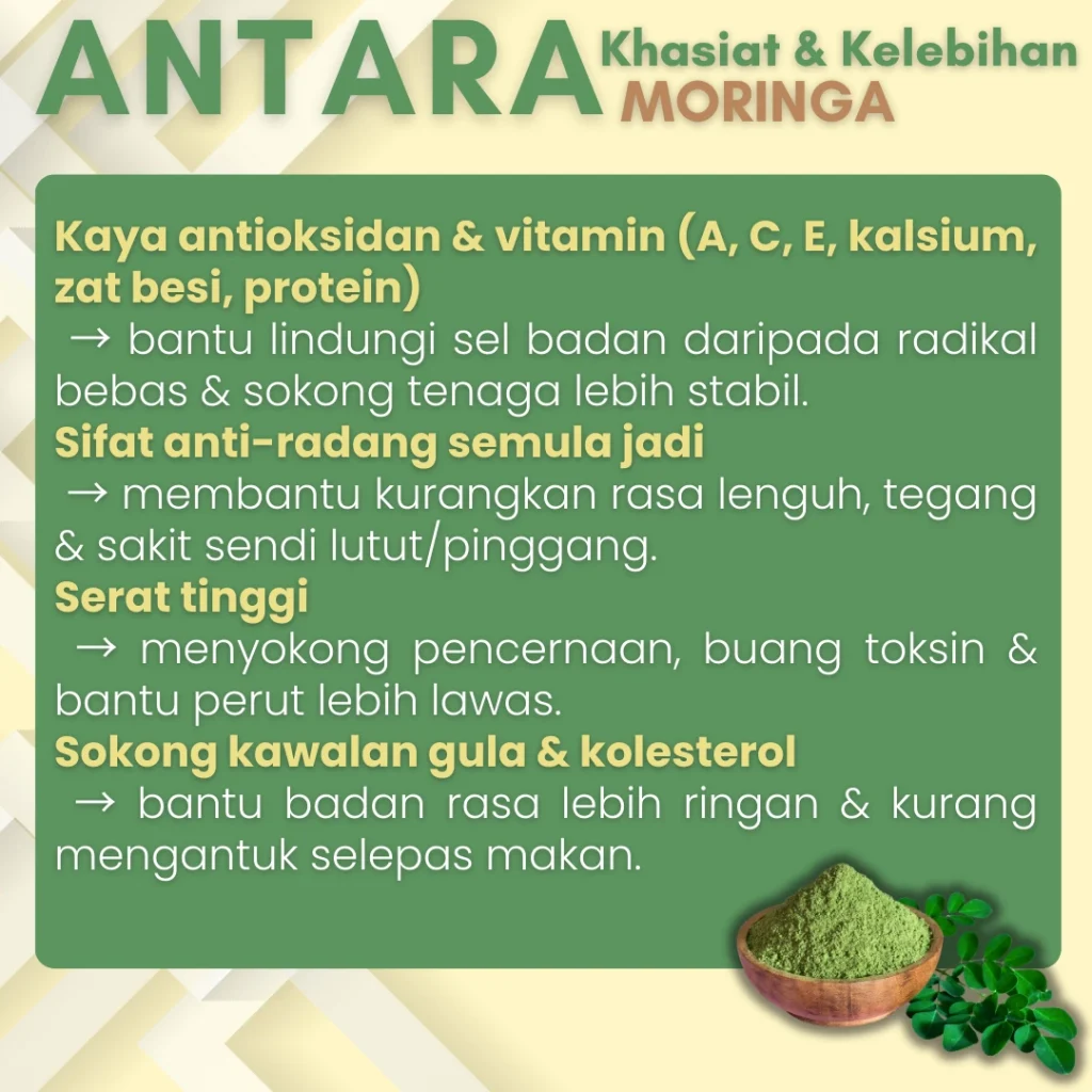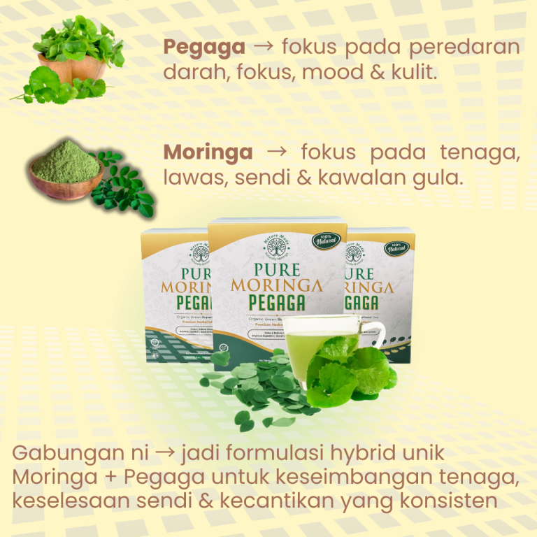 Produk ini bukan ubat. Ia tidak bertujuan untuk mendiagnosis, merawat, mengubat atau mencegah sebarang penyakit. Moringa Pegaga adalah makanan tambahan berasaskan herba yang digunakan secara tradisi untuk menyokong kesihatan umum. Keberkesanan mungkin berbeza mengikut individu.